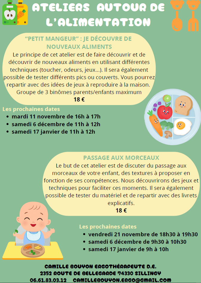 Le but de cet atelier est de discuter du passage aux morceaux de votre enfant, des textures à proposer en fonction de ses compétences. Nous découvrirons des jeux et techniques pour faciliter ces moments. Il sera également possible de tester du matériel et de repartir avec des livrets explicatifs.